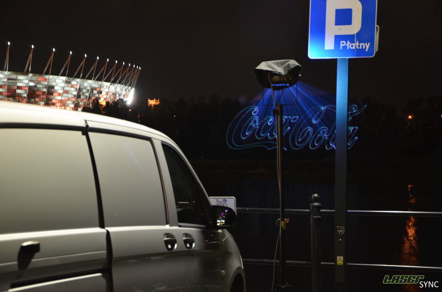 Warszawa, reklama laserowa dla Coca-Coli.